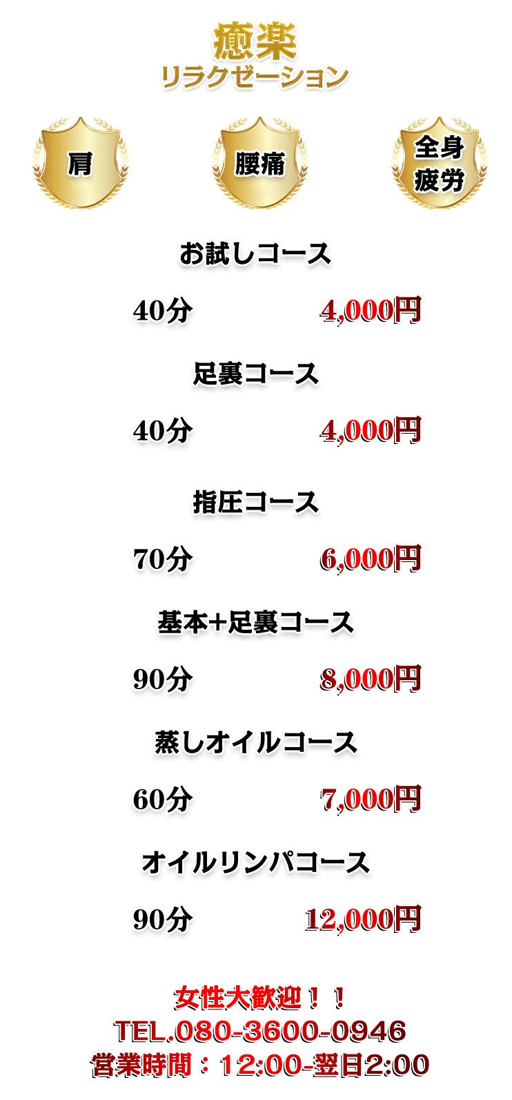 元気が出ない、やる気になれない、そんな日を迎えてしまっている貴男私たちがそんな貴男の身体と心のお疲れを取り除いて差し上げます優しい美人女性セラピストが今日も貴男をお待ちしております。